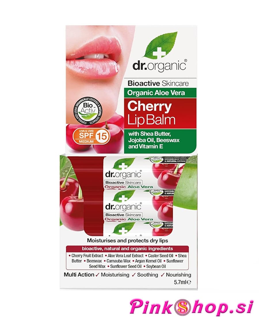 Balzam za ustnice z aloe vero in češnjo Dr. Organic – Vrhunske blagovne znamke in izbrana najboljša kozmetika na voljo v spletni trgovini Pinkshop.si